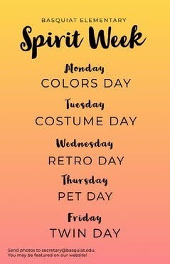 A typical spirit week occurs in the fall months and is designed to bring a spark of joy and creativity to any school campus. Typically — in an on-campus or virtual spirit week — teachers and students dress up according to daily themes and then celebrate those themes in and outside the classroom. Spirit weeks improve student morale, and they can be used as fundraisers or double as parents’ days.