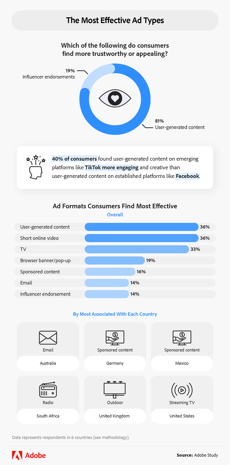 Sponsored content was also a top choice for some respondents (16%), especially in Germany and Mexico. This type of marketing content grabs consumer attention by demonstrating a trusted partnership between the promoted brand and its sponsor, giving it credibility. For example, when a blogger writes a post featuring a product that aligns with their readers’ interests, the audience is likely to trust their recommendation.