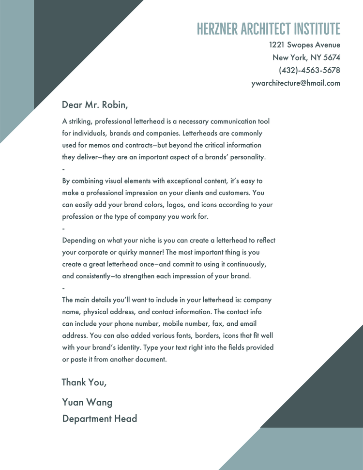 A business letter can incorporate photography, charts, and infographics, but it is critical that all these elements be utilized to inform and not just to illustrate what can otherwise be read within your letter’s text. Business letter design should be clean and professional — with no filler!
