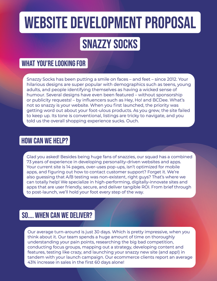 Before getting started, gather proposal examples from your industry or your competitors. You want to be sure your proposal reflects the standards and approach common to your industry, but remember that even though you’re writing for business, your letter is still for a reading audience. Take the time to research and understand their experience, expectations, and needs.
