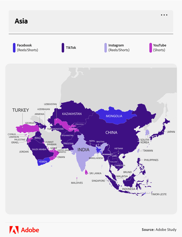 While our first chart detailed where search numbers were the highest for each platform, the next part of our study maps the most searched-for short-form video platforms associated with each country. We determined each country’s top platform by comparing their number of searches for each platform to the corresponding global averages.