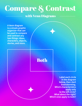If you’re wondering what Venn diagrams are used for, and what the benefits are of using a Venn diagram in your classroom, think about how frequently students practice comparing and contrasting items, concepts, or events. By overlapping circles, such as with three or four-way Venn diagrams, students can understand the commonalities between differing pieces of information.
