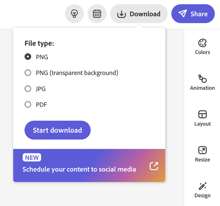 Click "Download" in the top right corner. Select whether you want your file to be a PNG, JPG, or PDF and click “Start download.”