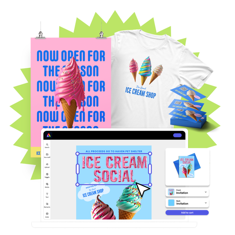 Bring your designs into the world with high-quality printed products made in Adobe Express, your all-in-one AI content creation app. Design and order printed flyers, posters, cards, business cards, t-shirts, and more– and have them delivered straight to your door in sustainable packaging.