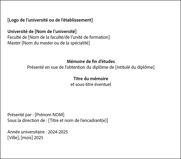 Une page de garde bien construite, sobre et claire, donne immédiatement une impression positive quant à la qualité globale de votre travail. Elle reflète l’attention portée aux exigences de forme et constitue le point de départ d’une lecture professionnelle du mémoire.