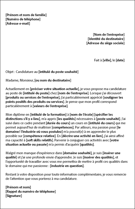 - « Malgré mon manque d’expérience dans [domaine souhaité], je suis [insérer des qualités] et j’ai une profonde envie d’apprendre ».