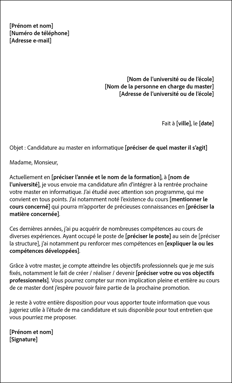 Exemple de lettre de motivation pour un master en informatique
