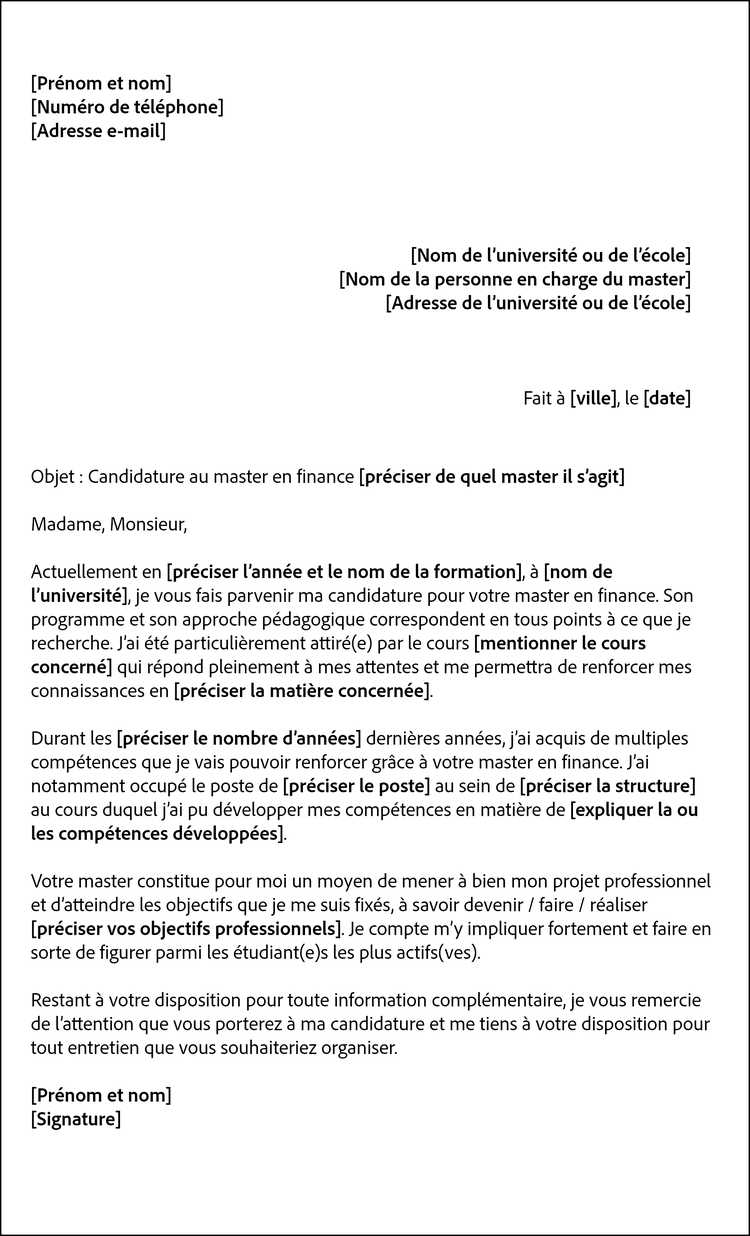 Vous trouverez ci-dessous un modèle de lettre de motivation pour un master en finance. Vous pouvez le télécharger et le personnaliser à votre guise.