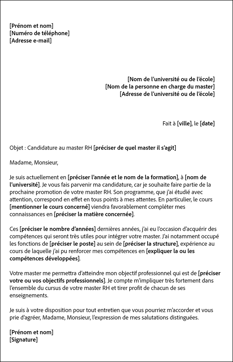 Vous devez apporter tout le soin nécessaire à la rédaction de l’introduction de votre lettre de motivation pour un master RH. Cette accroche est en effet décisive. Les personnes composant le jury lisent en effet de très nombreuses lettres, la vôtre doit se détacher du lot et retenir leur attention.