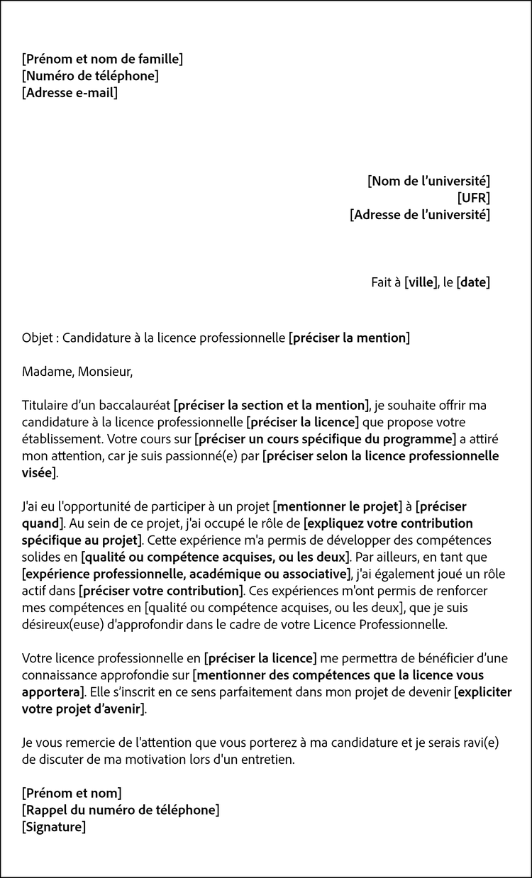 - « Titulaire d’un baccalauréat [préciser la section et la mention], je souhaite offrir ma candidature à la licence professionnelle [préciser la licence] que propose votre établissement ».