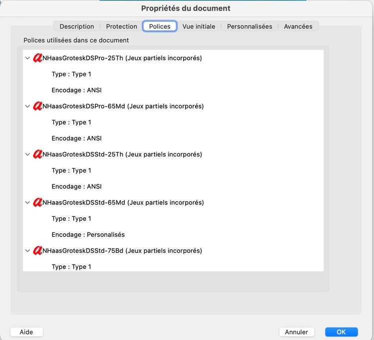 C’est la première étape à suivre pour déterminer quelles polices doivent être incorporées manuellement. Pour cela, allez dans Fichier > Propriétés > Polices et vérifiez la liste des polices utilisées pour votre document.