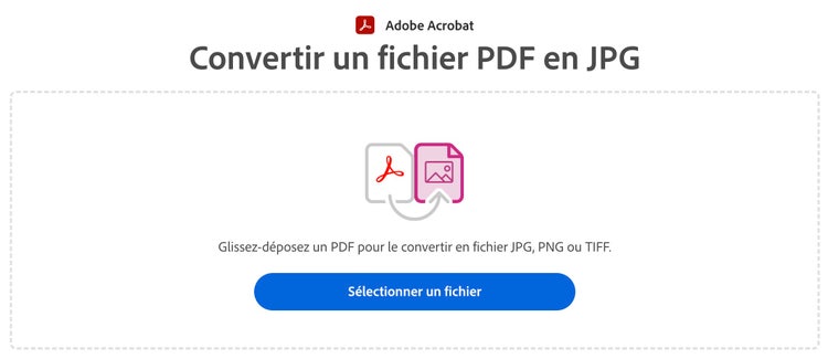- Convertissez votre image. Rendez-vous sur la plateforme en ligne d’Adobe Acrobat et sélectionnez Convertir > JPEG. Déposez ensuite votre fichier dans la zone dédiée.