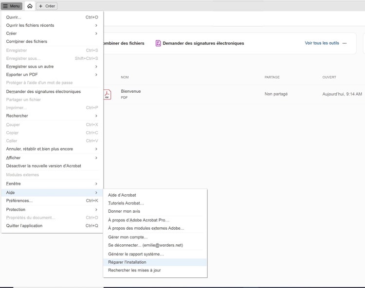 2. Réparez l’installation. Si le fichier PDF ne s’ouvre toujours pas après la mise à jour d’Acrobat Reader, allez dans Aide > Réparer l'installation.