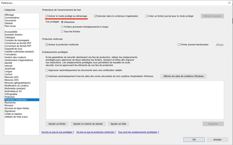 Si votre fichier PDF ne s'ouvre pas avec Adobe Acrobat, assurez-vous en premier lieu d’avoir installé la toute dernière version d’Acrobat. Puis, désactivez le mode protégé au démarrage. Pour cela, allez dans Édition > Préférences > Sécurité (renforcée). Sur cet écran, allez dans les protections sandbox et décochez l’option Activer le mode protégé au démarrage. Si vous ne recevez pas de message d’erreur indiquant que le fichier est corrompu et si le fichier ne s'ouvre tout simplement pas, ceci est la meilleure option.