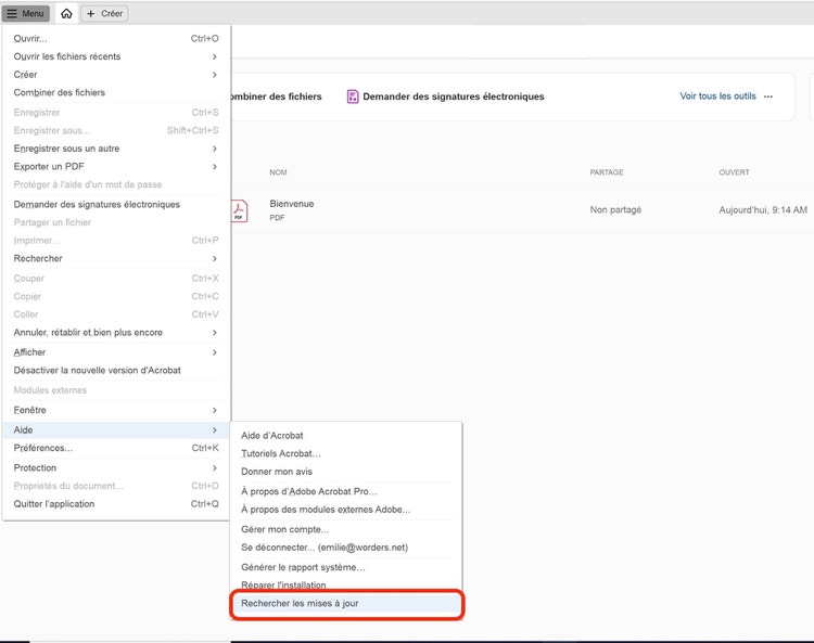 1. Procédez à une mise à jour d’Adobe Acrobat Reader. Le fait qu’Adobe Acrobat Reader ne soit pas à jour peut être une des raisons qui explique qu’un PDF ne s’affiche pas correctement. Lancez l'application et allez dans Aide > Rechercher les mises à jour.