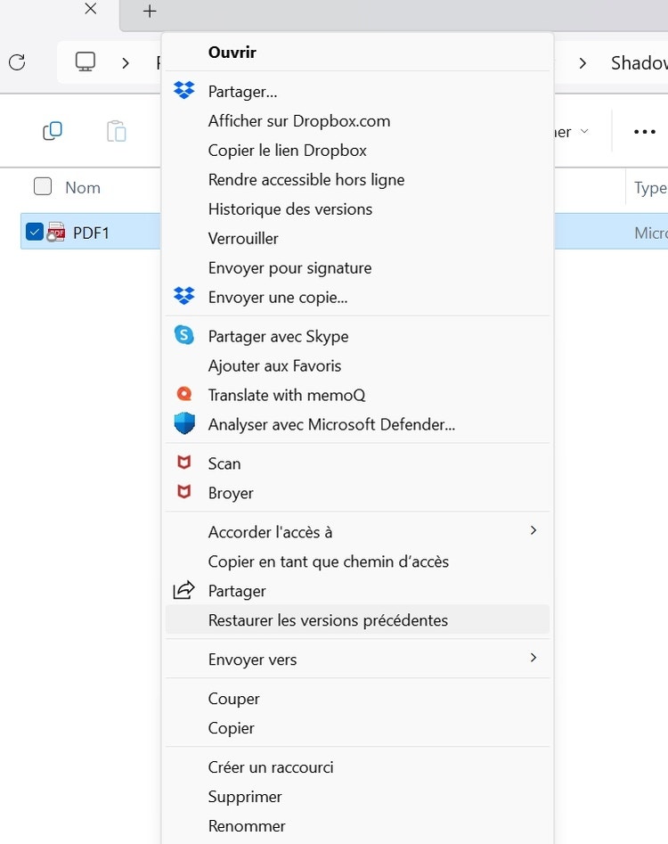 3. Restaurez la version précédente. Une autre méthode pour réparer un PDF endommagé consiste à restaurer une version précédente. Allez à l’emplacement où le PDF est enregistré, cliquez avec le bouton droit de la souris sur le fichier et sélectionnez Restaurer les versions précédentes.