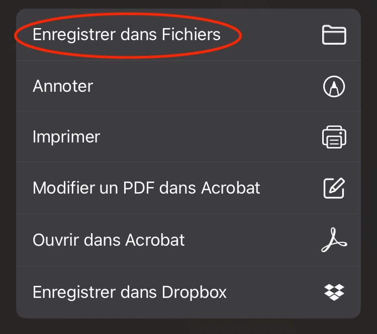 - Si vous avez besoin de modifier le PDF par la suite, y accéder sur un autre appareil ou encore l’envoyer à d’autres personnes, il vaut mieux enregistrer le document dans vos fichiers. Pour ce faire, appuyez sur l’option Enregistrer dans Fichiers et choisissez l’emplacement où vous souhaitez sauvegarder le PDF sur votre iPad.