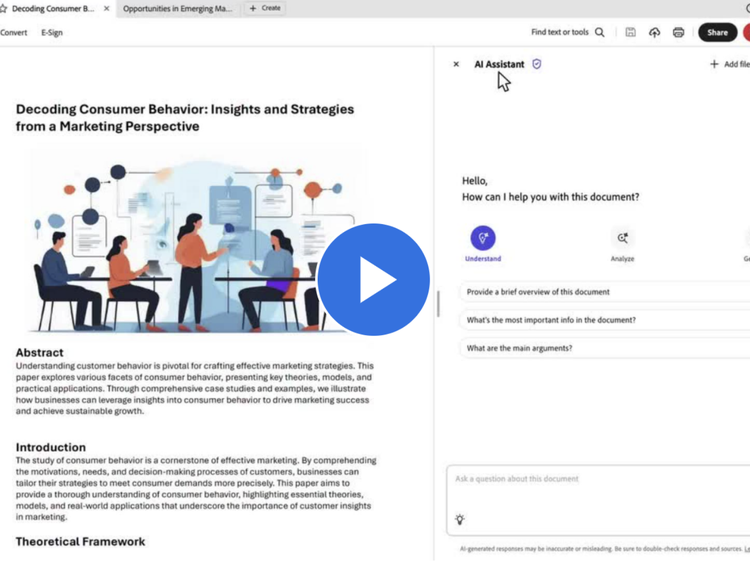 Découvrez les fonctionnalités de l’Assistant IA d’Acrobat pour des révisions encore plus efficaces. L’Assistant IA vous permet d'analyser vos documents, même les plus longs, de résumer vos cours, et vous aide même à vous entraîner en créant des quiz sur mesure. N'hésitez pas à explorer ses fonctionnalités !
