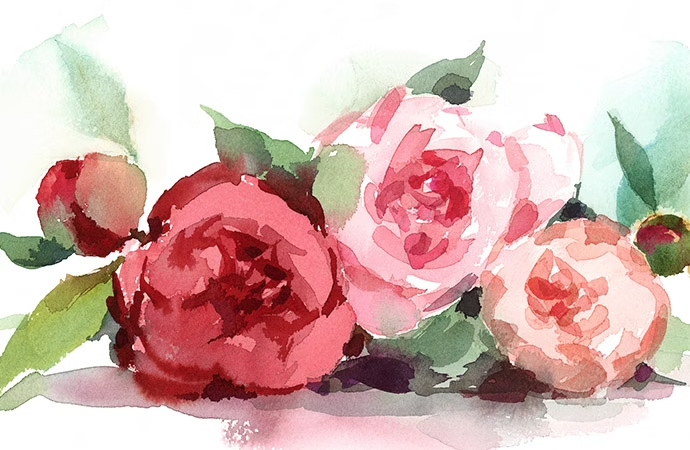 Leur représentation à l'aquarelle est particulièrement élégante, car la transparence de la peinture permet de reproduire fidèlement l'éclat des pétales et des feuilles au soleil. Vous pouvez commencer par une simple rose, en partant du centre et en utilisant davantage de pigment pour les pétales intérieurs. Peignez les pétales en spirales irrégulières, en ajoutant de l'eau et en appliquant des coups plus grands à mesure que vous progressez vers l'extérieur de la fleur. Pour les feuilles, ne vous préoccupez pas trop de la précision. Peignez des traits assurés, en laissant la dispersion de la peinture déterminer la forme des feuilles.