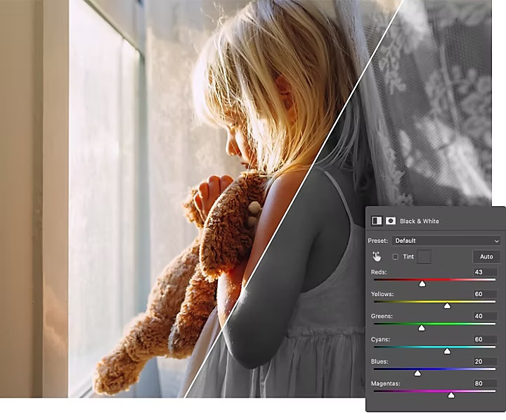 Convertissez d’abord la photo en noir et blanc à l’aide d’un calque de réglage Noir et blanc. Testez différents paramètres prédéfinis ou ajustez les curseurs de couleurs pour chacun d’eux afin de modifier le rendu de votre photo. Déplacez les curseurs vers la droite pour éclaircir certaines zones, ou vers la gauche pour les obscurcir. Vous pouvez également utiliser l’outil Réglage ciblé. Il vous suffit alors de cliquer et de déplacer le curseur sur l’image pour modifier les curseurs du paramètre prédéfini en conséquence.