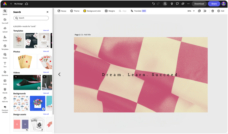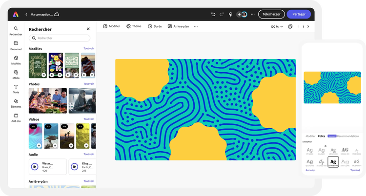 Découvrez des modèles conçus par des professionnels pour vous mettre sur la voie ou créez votre arrière-plan à partir de zéro. Créez un thème pour vos créations à l'aide de photos, d'icônes, de logos, de polices personnalisées et d'autres éléments personnalisables pour leur donner un aspect authentique. Avec Adobe Express, il est facile et gratuit de créer, d'enregistrer et de partager vos créations en quelques minutes.