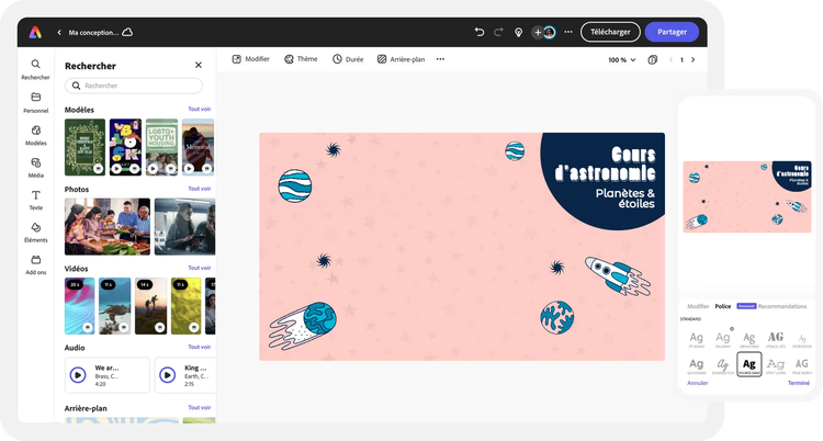 Vous pouvez démarrer votre projet à partir de la collection de photos, vidéos ou fichiers audio libres de droits d’Adobe Stock.