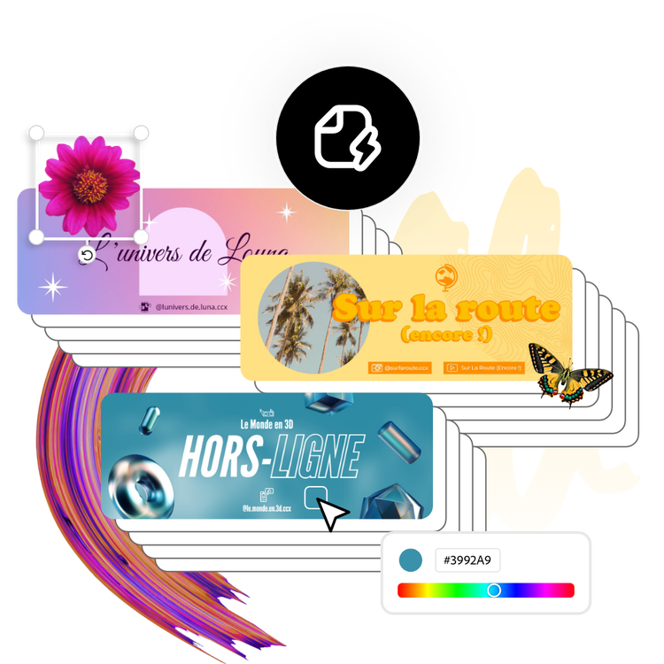 Concevez une bannière de lecteur vidéo personnalisée (ou une bannière hors ligne) qui convient parfaitement à votre page Twitch. Commencez par un modèle ou créez votre propre design personnalisé en utilisant vos images, votre palette de couleurs et votre logo. Choisissez parmi des milliers d'images de stock ou d'éléments graphiques à ajouter au design et ajoutez des animations pour capter l'attention de votre public.