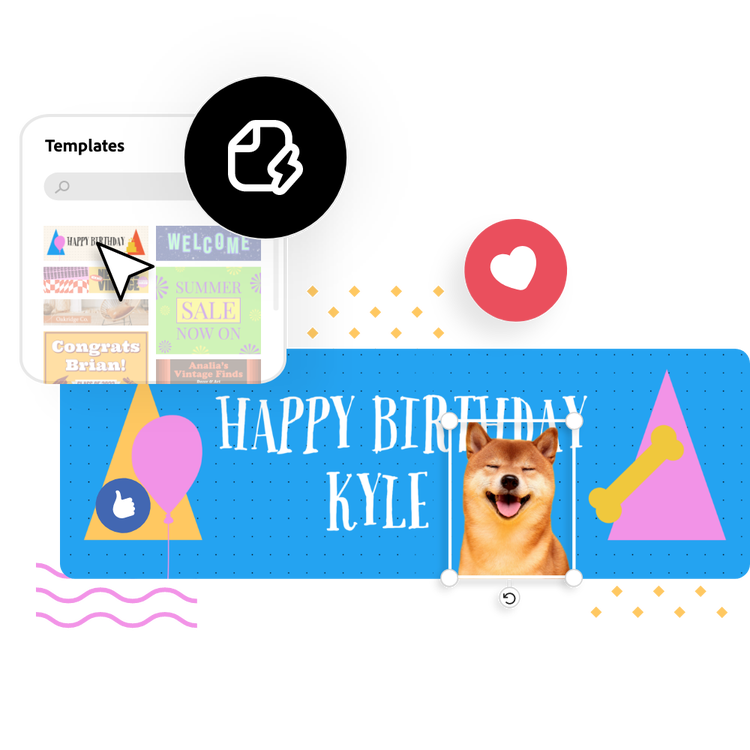 Découvrez des modèles conçus par des professionnels pour vous mettre sur la voie ou créez votre bannière vinyle à partir de zéro. Créez un thème pour vos créations à l'aide de photos, d'icônes, de logos, de polices de caractères personnalisées et d'autres éléments personnalisables pour leur donner une touche d'authenticité. Avec Adobe Express, il est facile et gratuit de créer, d'enregistrer et de partager vos créations en quelques minutes.