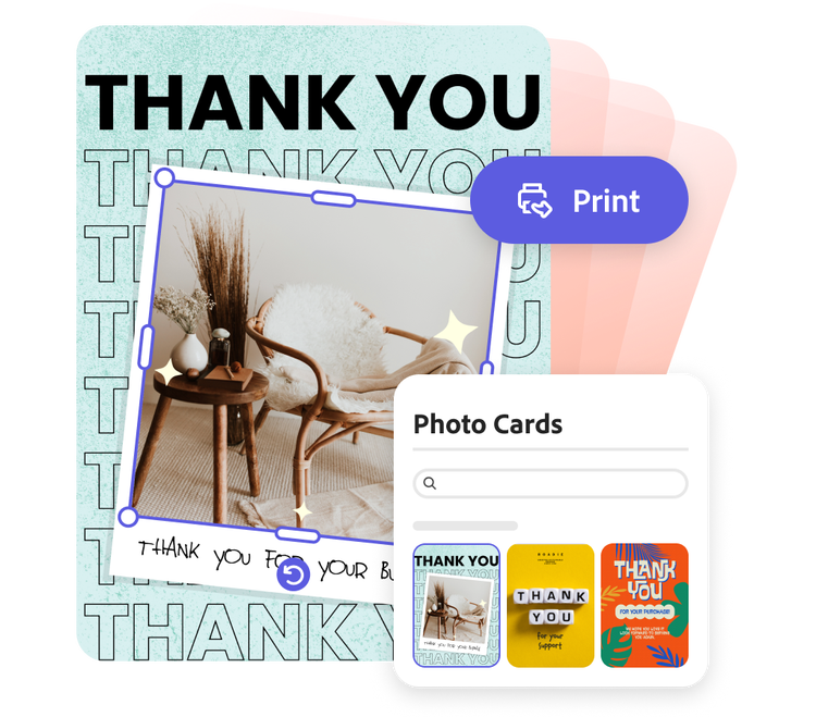 La qualité d’impression est essentielle en matière de photos. Offrez à votre carte photo le rendu qu’elle mérite en commandant des impressions de haute qualité sans quitter l’application Adobe Express. La livraison de vos cartes est aussi simple que leur création. Il vous suffit de cliquer sur Imprimer depuis le créateur de cartes photos et de suivre les étapes pour définir vos paramètres d’impression (utilisateurs sur ordinateur de bureau aux États-Unis, au Royaume-Uni, en Australie et au Canada uniquement).
