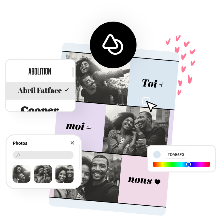 Explorez des modèles conçus par des professionnels pour vous mettre sur la voie ou créez votre carte de Saint-Valentin de toutes pièces. Définissez un thème pour vos créations à l'aide de photos, d'icônes, de logos, de polices personnalisées et d'autres éléments personnalisables afin de leur donner une touche d'authenticité. Avec Adobe Express, il est facile et gratuit de créer, d'enregistrer et de partager vos créations en quelques minutes.