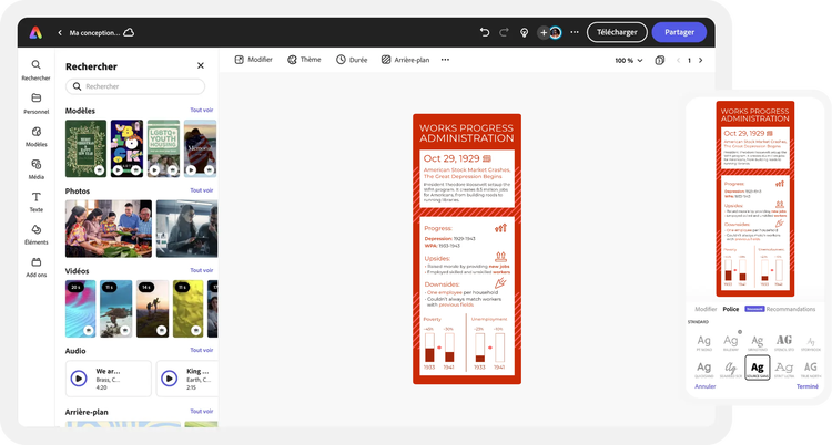 Avant de finaliser la conception de votre graphe à barres, invitez des collaborateurs à participer à la révision de votre travail. Téléchargez et partagez votre nouveau graphe à barres où vous le souhaitez, ou ajoutez-le à de futures présentations et documents réalisés avec Adobe Express. Revenez-y à tout moment pour le mettre à jour.