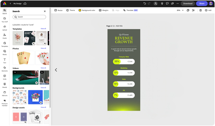 Le graphique en barres de progression n’est qu’un élément de votre présentation. Créez un affichage attrayant en ajoutant des images, des vidéos et des polices de haute qualité provenant d’Adobe Stock, ainsi que des animations, des icônes et des formes accessibles en un clic. Si vous ne savez pas par où commencer, Adobe Express propose un grand nombre de modèles personnalisables ainsi que des combinaisons de couleurs et des recommandations de polices à associer à votre graphique en barres de progression.
