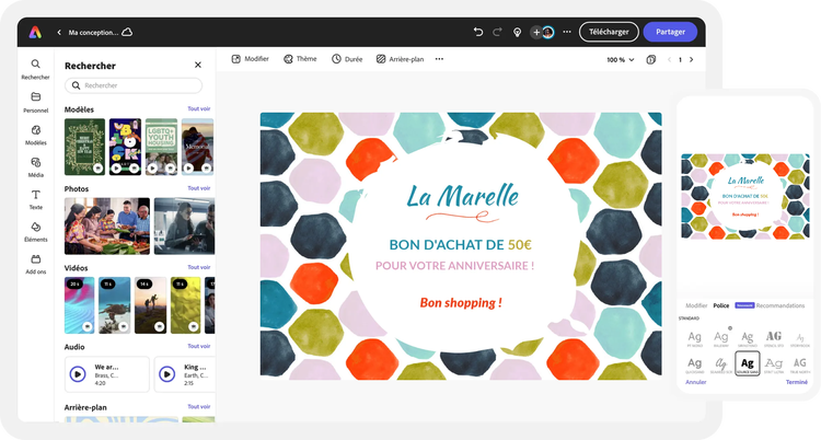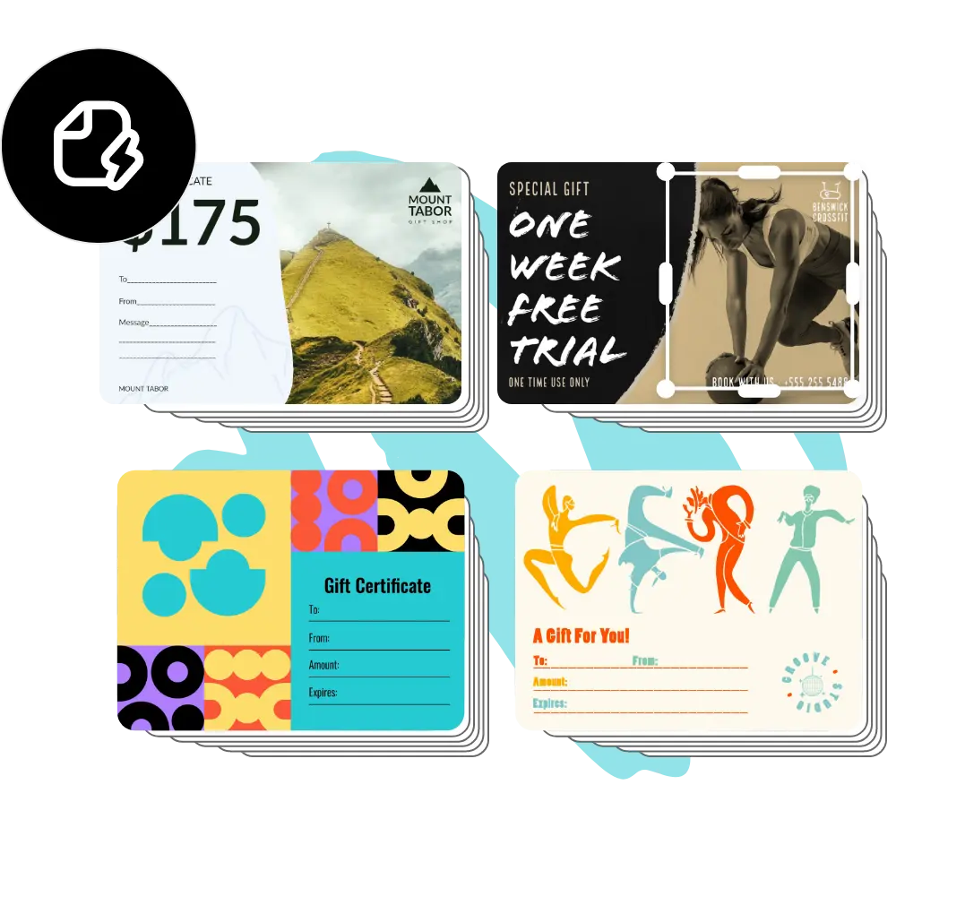 Découvrez des modèles conçus par des professionnels pour vous aider à commencer ou créez votre chèque-cadeau de toutes pièces. Définissez un thème pour vos créations à l'aide de photos, d'icônes, de logos, de polices personnalisées et d'autres éléments personnalisables pour leur donner un aspect authentique. Avec Adobe Express, il est facile et gratuit de créer, enregistrer et partager vos créations en quelques minutes.