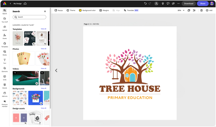 Changez de couleur ou essayez de nouveaux styles de police. Choisissez l'option « Personnaliser » plus pour ouvrir votre logo dans l'éditeur Adobe Express complet.Enregistrez et partagez votre logo d'arbre.