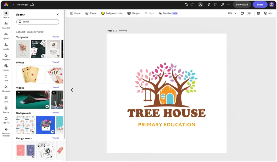 Lorsque vous avez terminé, téléchargez des fichiers PNG et JPG de haute qualité de votre nouveau logo d'arbre. Téléchargez votre logo dans la section « Marques » d'Adobe Express pour l'appliquer instantanément à vos futures créations. Présentez votre logo sur des prospectus, des cartes de visite, des marchandises, des supports marketing, des réseaux sociaux et tout ce dont vous pouvez rêver.