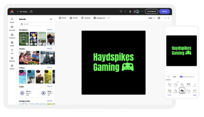 Personnalisez davantage votre logo Twitch dans l'éditeur en ligne Adobe Express. Choisissez parmi des dizaines de styles d'animation à appliquer au texte ou aux images de votre logo. Téléchargez ensuite votre logo animé sous forme de fichier MP4 pour le partager dans des introductions vidéo, des clips de médias sociaux et même sur votre blog ou votre site web.