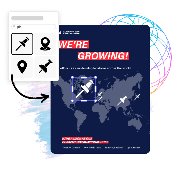 Une fois votre nouvelle carte ajoutée à votre projet Adobe Express, vous pouvez la modifier à l’infini. Modifiez la couleur et l’arrière-plan. Arrangez-la avec d’autres cartes pour représenter une tranche du monde. Ajoutez des icônes pour illustrer des informations importantes. Ou retournez-la pour faire croire qu’il s’agit d’un monde imaginaire que vous avez créé.