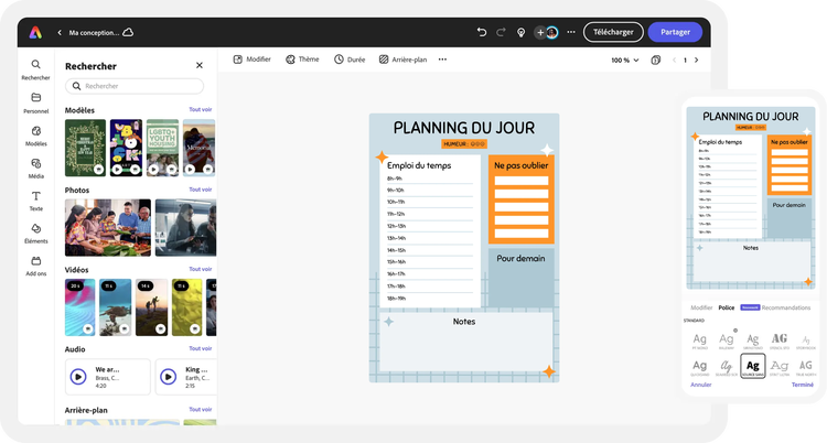 Explorez des modèles conçus par des professionnels pour vous mettre sur la voie ou créez votre agenda à partir de zéro. Créez un thème pour vos créations à l'aide de photos, d'icônes, de logos, de polices de caractères personnalisées et d'autres éléments personnalisables afin de leur donner une touche d'authenticité. Avec Adobe Express, il est facile et gratuit de créer, d'enregistrer et de partager vos créations en quelques minutes.