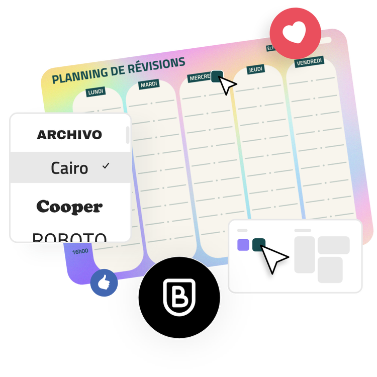 Explorez des modèles conçus par des professionnels pour vous mettre sur la voie ou créez votre propre emploi du temps à partir de zéro. Créez un thème pour vos créations à l'aide de photos, d'icônes, de logos, de polices de caractères personnalisées et d'autres éléments personnalisables afin de leur donner une impression d'authenticité. Avec Adobe Express, il est facile et gratuit de créer, d'enregistrer et de partager vos créations en quelques minutes.