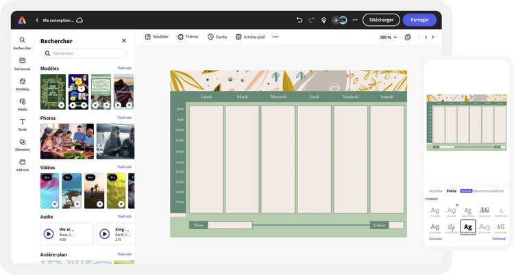 Explorez des modèles conçus par des professionnels ou créez votre emploi du temps à partir de zéro. Créez un thème à l'aide de photos, d'icônes, de logos, de polices de caractères et d'autres éléments personnalisables. Dupliquez vos créations et redimensionnez-les pour assurer la cohérence de plusieurs versions. Avec Adobe Express, il est facile et gratuit de créer, d'enregistrer et de partager vos créations en quelques minutes.