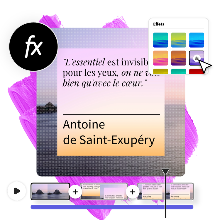 Sélectionnez n'importe quel élément de votre vidéo et ajoutez des effets animés ou des transitions pour un rendu dynamique.