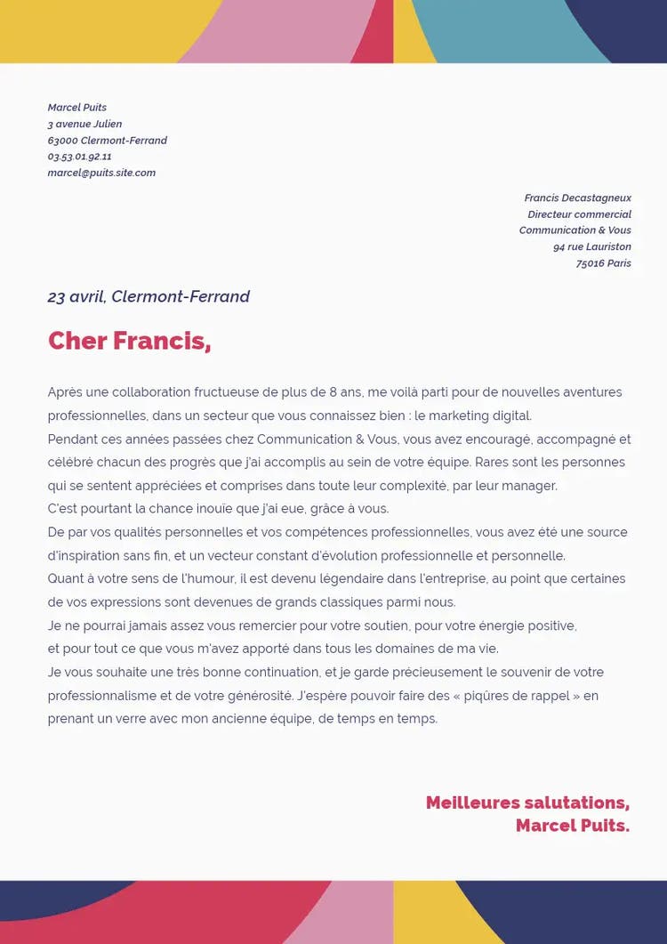 - Envoyez un message de départ : Exprimez votre reconnaissance pour l’expérience acquise ensemble et donnez vos coordonnées à vos collègues.