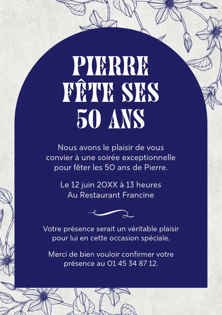 Adobe Express vous propose des modèles et des outils de personnalisation pour réaliser vos idées de fête préférées pour votre 50e anniversaire. Si vous souhaitez utiliser des idées de 50e anniversaire dans des cartes, des lettres, des posters, des bannières, des collages, des flyers, des annonces ou d'autres projets créatifs, Adobe Express vous propose des modèles à personnaliser et des outils conviviaux pour laisser parler votre propre créativité. Quel que soit le message que vous souhaitez transmettre, Adobe Express lui donnera vie. Et vous n’avez besoin d’aucune expérience.