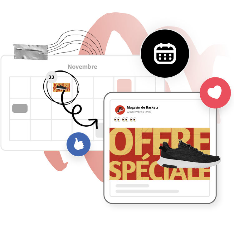 Gagnez du temps et développez votre marque avec le planificateur de contenu Adobe Express. Créez, planifiez, prévisualisez votre contenu et programmez des publications sur TikTok (Nouveau), Instagram, Facebook, X (Twitter), Pinterest et LinkedIn en toute simplicité, disponible sur ordinateur de bureau et sur notre application mobile.