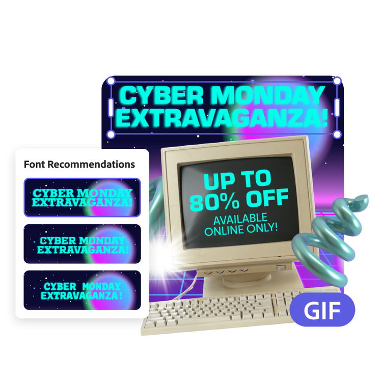 Que ce soit pour un post sur les réseaux sociaux ou une discussion entre amis, vous voulez envoyer un GIF qui dit exactement ce que vous avez en tête. Utilisez l’outil Texte d’Adobe Express pour ajouter une punchline à n’importe quel GIF, qu’il soit nouveau ou existant. Parcourez des milliers de polices Adobe Fonts pour trouver celle qui correspond au thème de votre GIF.