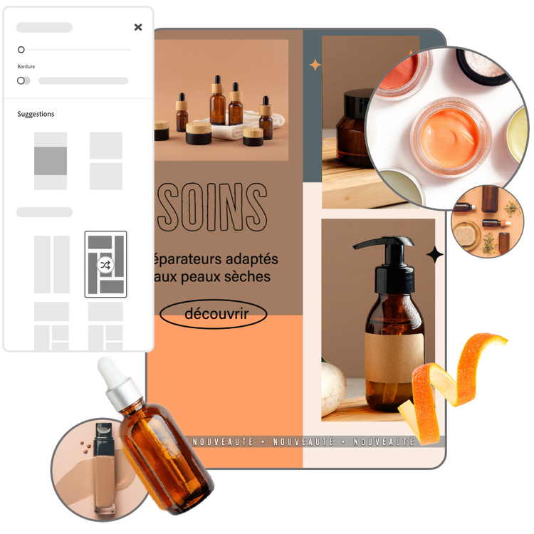 Une fois que vous avez mélangé et assorti vos photos, graphiques, modèles, icônes et textes à votre convenance, transformez votre projet photo statique en un message social époustouflant à l’aide de l'animation. Ajoutez des effets animés à n'importe quel élément de votre projet, des transitions dynamiques au texte flottant, pour que chaque partie de votre message visuel brille. Vous pouvez même ajuster l'épaisseur de la bordure pour donner de l'éclat à votre création.