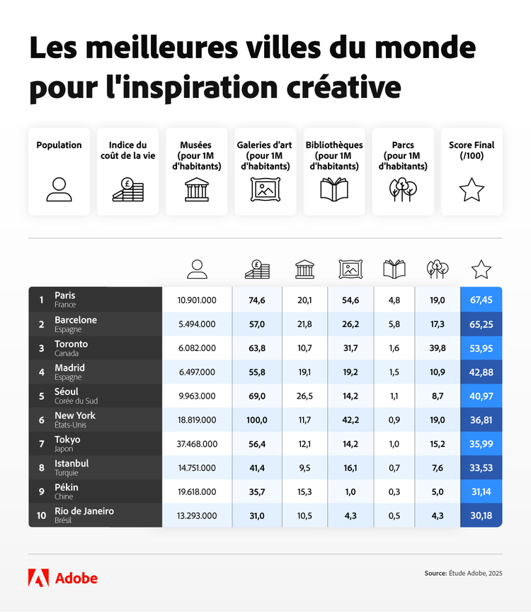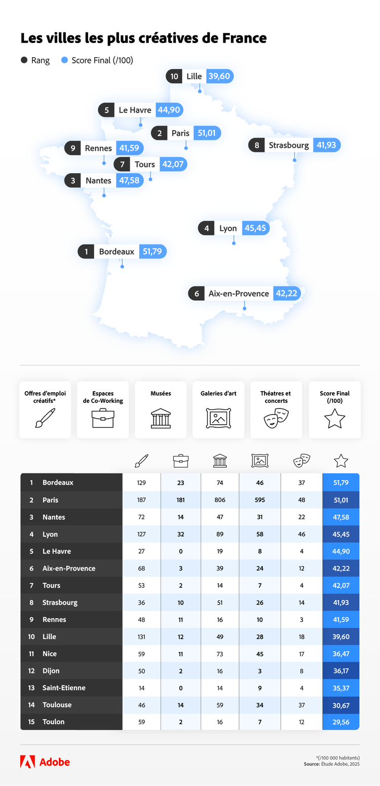 Pour le savoir, l'équipe d'Adobe Express a analysé 20 villes françaises et 40 destinations internationales afin d'identifier les villes les plus propices à la créativité des travailleurs à distance. Chaque ville a été évaluée en fonction de facteurs tels que le nombre d'espaces de travail collaboratif, de parcs, de musées et de théâtres, ainsi que de paramètres externes liés à la créativité comme le coût de la vie.