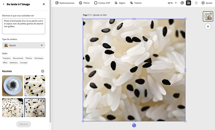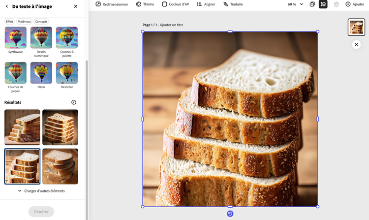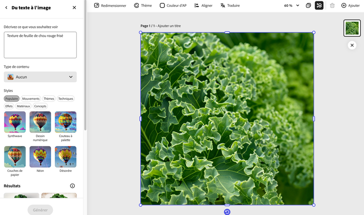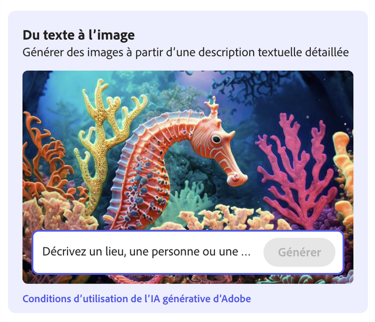Votre imagination est le livre de cuisine ainsi que le garde-manger et nous sommes la cuisine de vos rêves. L'application Texte en Image d'Adobe Express commence par une description de l'image que vous souhaitez créer. Prenez un peu de temps pour vous entraîner aux messages-guides afin de perfectionner votre art - soyez précis, descriptif et original.