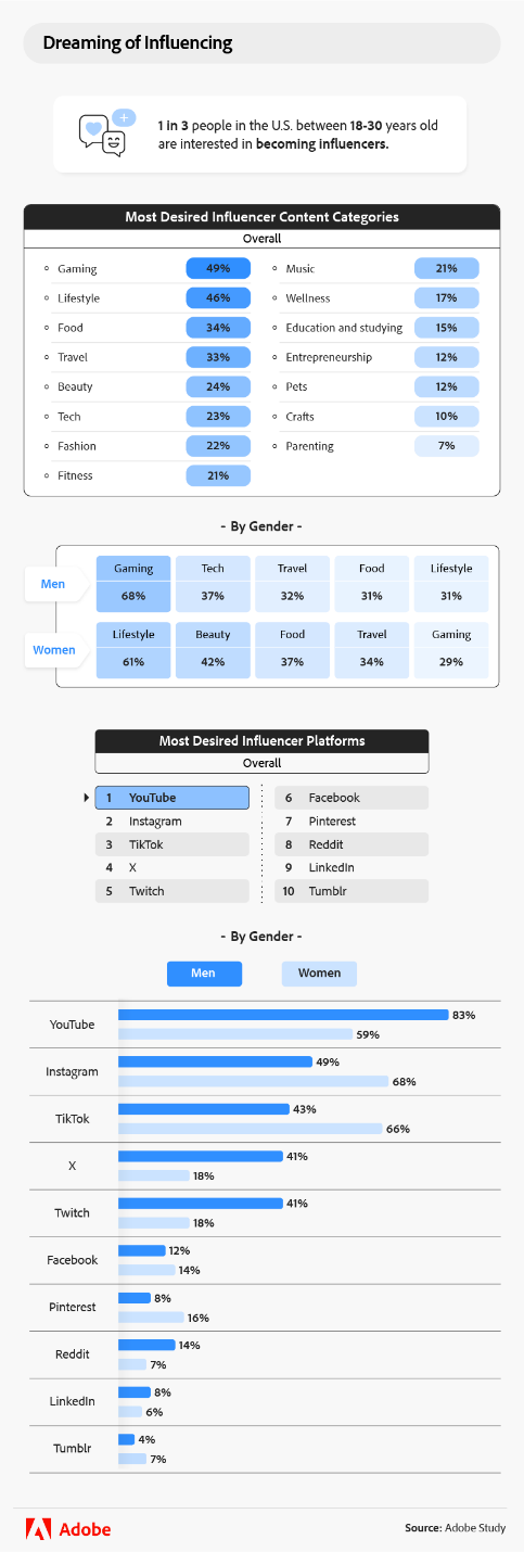 Un tiers des jeunes de 18 à 30 ans aux États-Unis ont déclaré qu'ils rêvaient de devenir influenceurs sur les réseaux sociaux. Ils sont surtout intéressés par la création de contenu sur les jeux, le style de vie et l’alimentation sur YouTube, Instagram et TikTok. Les hommes sont beaucoup plus susceptibles de vouloir devenir des influenceurs sur Twitch et X (anciennement Twitter) que les femmes.