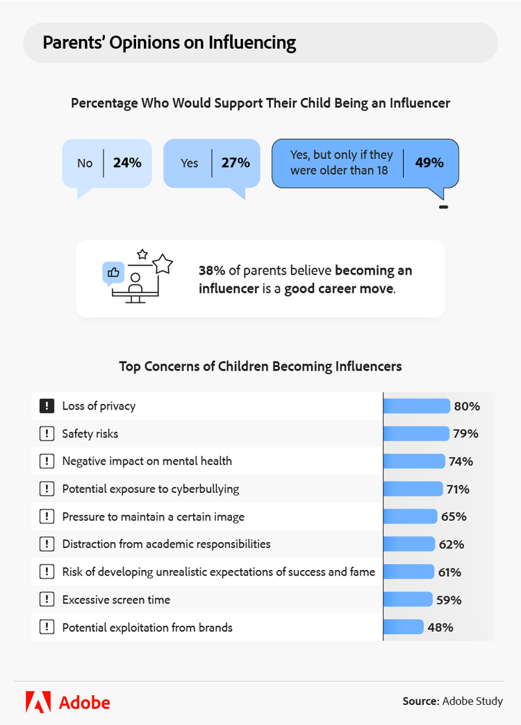 Les parents ont exprimé des inquiétudes quant aux défis posés par le mode de vie des influenceurs, la perte de vie privée arrivant en tête de liste. Les inquiétudes des parents portent aussi sur les publications sur les réseaux sociaux à propos de leurs enfants et le partage d'informations personnelles et de photos d'enfants qui présentent des risques d’exploitation tout au long de la vie. Une proposition de loi dans l'État de Washington vise à résoudre ce problème en permettant aux enfants de demander le retrait de ce type de contenu lorsqu'ils atteignent un certain âge.